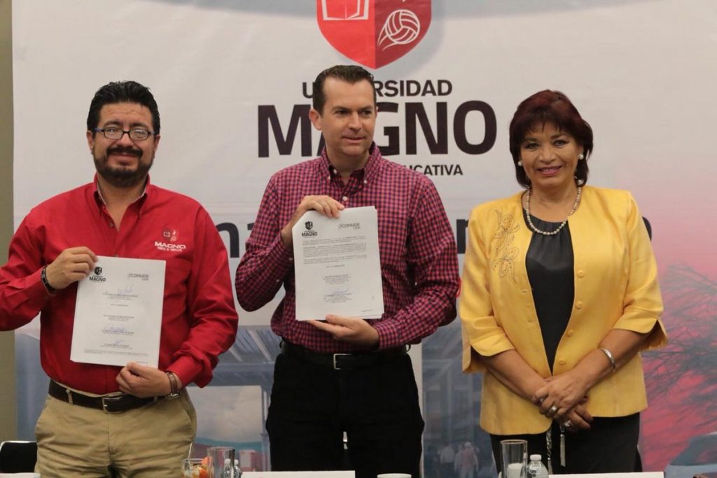 León, Guanajuato., a 7 de junio 2019.- Este viernes la Comisión Municipal de Cultura Física y Deporte de León, Guanajuato (Comude León) y la Universidad Magno firmaron un convenio de colaboración convirtiéndose en la universidad con más y mejores instalaciones deportivas del país para la formación de profesionales en el deporte.