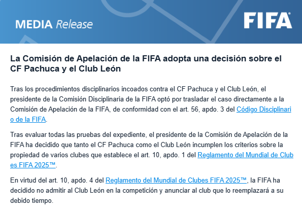 Sin embargo, la propia FIFA dio a conocer la exclusión del equipo Verde “Tras evaluar el expediente y procedimientos disciplinarios, la FIFA ha decidido no admitir al Club León en la competición, y anunciará al equipo que lo reemplazará en su debido tiempo”, señala dicho comunicado.