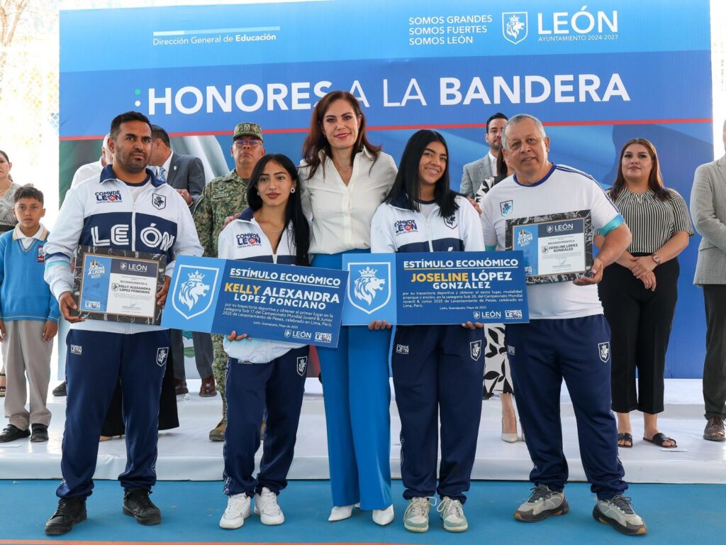 León, Guanajuato, 20 de mayo. – Tras su actuación en los pasados mundiales de halterofilia, las leonesas Kelly López Ponciano y Joseline López, recibieron un reconocimiento y estímulo económico por parte la alcaldesa Alejandra Gutiérrez municipal, esto en el marco de los honores a la bandera efectuados en la primaria Sor Juana Inés de la Cruz.
